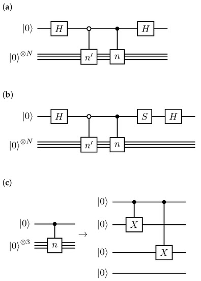 An example of a controlled-n gate that prepares target qubits in state is shown in Figure 1c. In practice, this part of the circuit requires two-qubit gates (e.g., CNOT) and perhaps the need for full connectivity of qubits in order to operate on any two qubits. Full connectivity of qubits could potentially be realized with ion-trapped devices [22]. See Section 6 for further discussion.