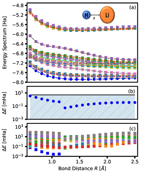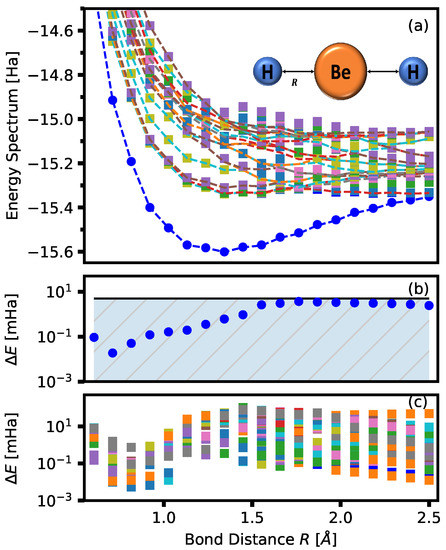 Figure 3a shows the ground state energy, as well as a few low-lying excited states, for BeH of the effective Hamiltonian. The exact energies are given by the dashed curves in Figure 3a. In Figure 3b, the difference between the exact and obtained ground state energy is shown. An error within the hatched area indicates results that are within chemical accuracy. Chemical accuracy is typically identified as Hatrees. Figure 3c shows the same energy difference for all other excited-state energies. The same process is done for LiH where only S and D configurations are used. The total number of permutations of 4 fermions (495) is reduced to , and the results are shown in Figure 4.