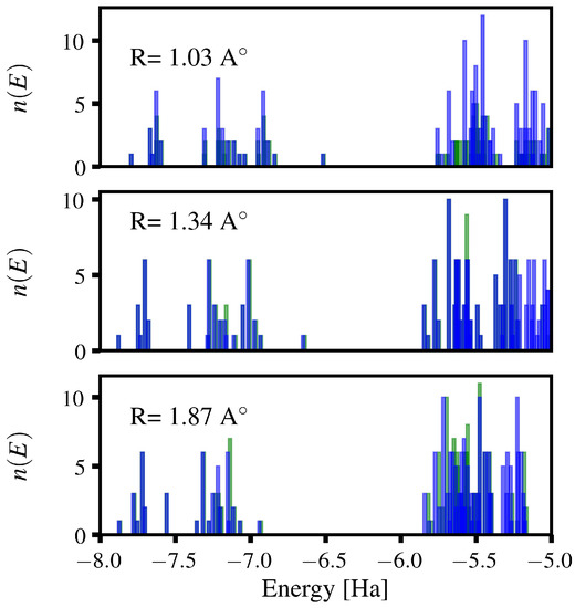 For every distance R, a set of computational bases is chosen. This set includes the basis with the lowest energy expectation (the reference configuration) and computational bases that correspond to the low-order excitations (i.e., S, D, etc.) with respect to the reference configuration. In the case of BeH, we construct the effective Hamiltonian matrix by keeping the S, D, and T excitations; thus, the total number of computational bases for BeH is . The low dimension of the effective Hamiltonian matrix makes it possible to diagonalize the matrix on a classical computer using standard numerical techniques [32]. Thus, the lowest energies, including the ground state energy, are obtained at every R. The results for this process are shown in Figure 3.