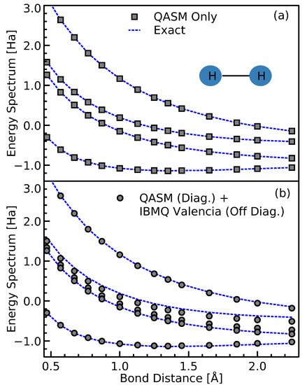 As a sanity check, we first use IBMQ QASM simulator [36] to perform all steps involved as outlined in Section 3. The calculations are shown in Figure 6a. The results perfectly match the exact values as expected. Furthermore, in Figure 6b the off-diagonal terms in the Hamiltonian are evaluated using IBMQ Valencia device, while the diagonal elements are evaluated using the IBMQ QASM simulator. In both cases, upon diagonalization of the obtained Hamiltonian, the energy spectrum is in good agreement with the exact values. We observe in Figure 6b that there is a slight lifting of the double degeneracy of H, which we associate to the device noise. This is due to the occurance of non-zero values in the measured off-diagonal terms when in fact the exact value should be zero.