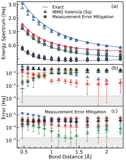 Finally, all the matrix elements, that is, diagonal and off-diagonal elements, are evaluated using IBMQ Valencia device. The results are shown in Figure 7a, which was done with and without measurement error mitigation. The use of measurement error mitigation marginally improves the results. The discrepancy between the exact and hardware values, without and with measurement error mitigation, are shown in Figure 7b,c.