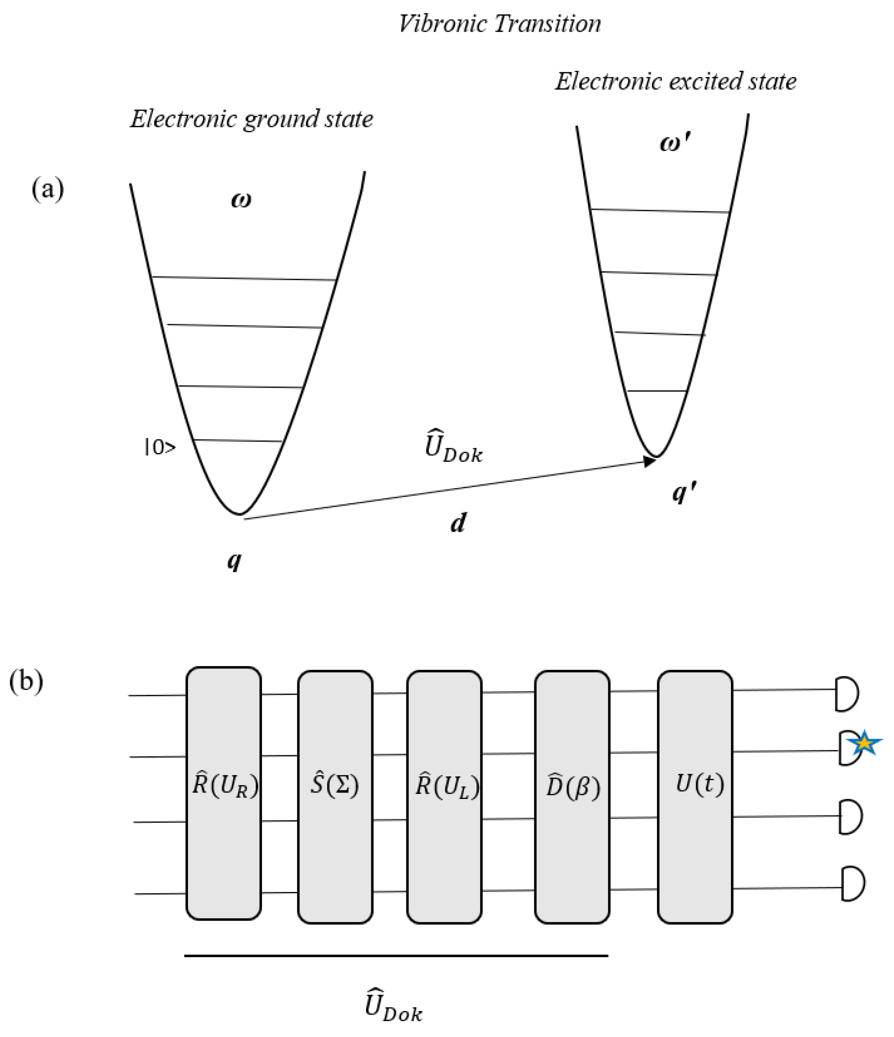- Sawaya, N.P.; Huh, J. Quantum algorithm for calculating molecular vibronic spectra. J. Phys. Chem. Lett. 2019, 10, 3586–3591. [Google Scholar] [CrossRef]