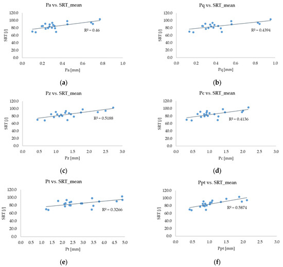 The final dataset included twenty sets of surface-related texture parameters, corresponding to the inspected surfaces. Each set consisted of four overall roughness parameters and four extreme roughness parameters [44] and one standard pavement texture evaluation parameter MPD [5]. This dataset was also tested for distribution type, again showing non-normal distribution of parameters. Kendall’s correlation coefficients are given in Table 4, where it can be seen that most parameters exhibit statistically significant correlation with each other and moderate to strong correlation to measured friction, except the parameter Pvt which was also statistically insignificant for the SRT values. Correlation analysis was performed to investigate the relationship among the parameters and their correlation to measured friction performance expressed in SRT values. Kendall’s correlation coefficient was again selected as a measure of monotonic and non-linear relationship, since the generated scatter plots showed no strong linear relationship (Figure 6). Obtained coefficients of determination range from 0.146 for Pvt to 0.587 for Ppt parameter versus SRT friction.