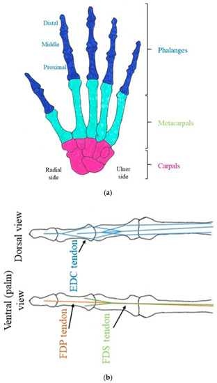The hand is comprised of twenty-seven different bones consisting of phalanges, metacarpals and carpals (Figure 1). Effective function is coordinated by a linkage system of tendons, ligaments and muscles. Tendons transmit loads from the bones to the intrinsic muscles and are interconnected by aponeuroses; this is commonly referred to as the extensor mechanism [15,16]. All fingers have an extensor tendon, located on the posterior surface of the hand, and two flexor tendons, located on the palmar side; furthermore, the second and fifth fingers have an additional extensor tendon. The extensor digitorum communis (EDC) straightens the finger [17] from both the proximal and distal interphalangeal joints. Flexing (bending) of the finger is achieved through the flexor digitorum profundus (FDP) and the flexor digitorum superficialis (FDS) tendons that connect to the distal and middle phalanx, respectively. Flexor tendons are channelled through and constricted by the tendon sheath [18], with some lubrication provided by synovial fluid.