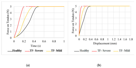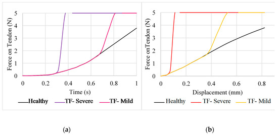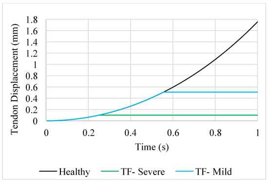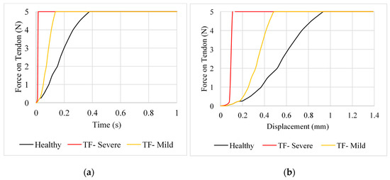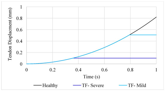 Displacement of the tendons themselves was negligible during abduction for position B. For this motion, measuring the displacement of each node from its initial position provided much clearer results. Comparing the force–displacement graph for position B (Figure 6) to that of the extended finger in position A (Figure 3), the finger is able to undergo a larger displacement before an increase in force is observed. For the severe case of trigger finger in position B, force starts to increase rapidly at a displacement of 6.98 mm and at 7.53 mm for the mild trigger finger. Additionally, the rate of increase in force for severe trigger finger does not differ from that of the healthy tendon until 0.625 s, whereas the equivalent point was observed at 0.3125 s in position A.