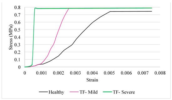 A “toe” region is observed in the stress–strain curves (Figure 8) of the hyper-extension movement of the finger before the relationship becomes linear. The mildly affected tendon can withstand a greater amount of strain over a longer period before triggering occurs. The mildly affected tendon reached a strain of 0.26% at the maximum stress of 0.78 MPa, whereas the severely affected tendon only reaches a strain of 0.059%.