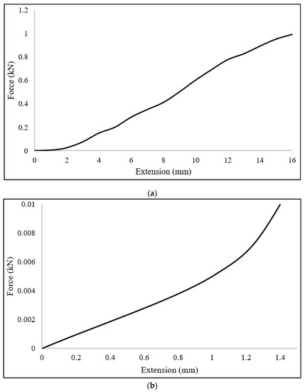 Sample force-extension data used to simulate tendons. (a) Full data set used from the literature [46]; (b) portion of the data relevant to the loading range within the simulations solved.