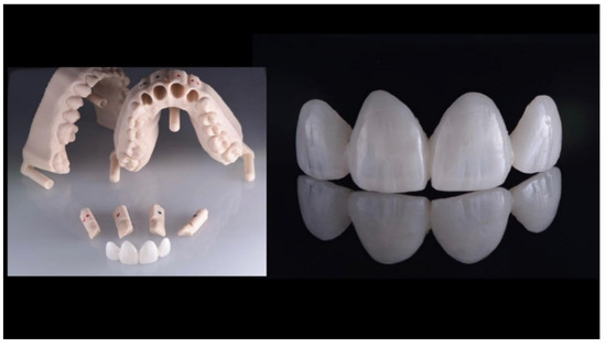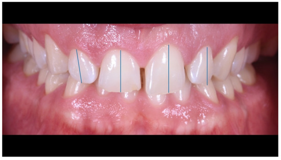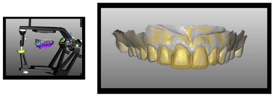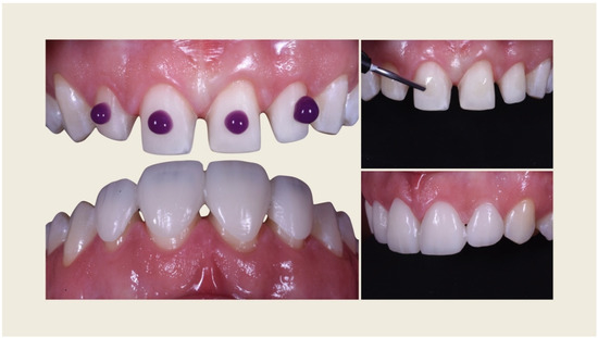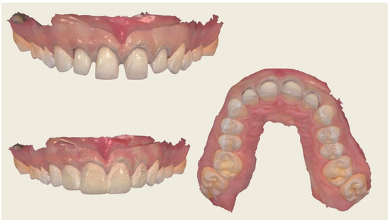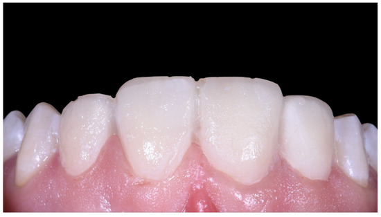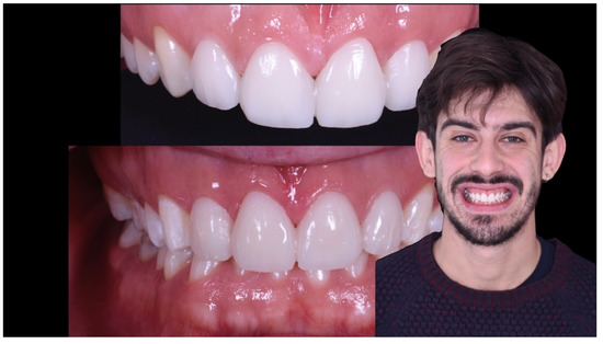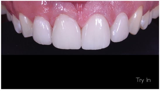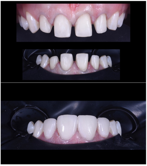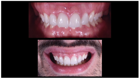 The introduction of digital workflows in dentistry has simplified and accelerated the individual work. The aesthetic treatment of the frontal group is the most demanding challenge for the dental team, and it provides a diagnostic framework extended not only to the dental component [1]. The dento-gingival analysis and the mock-up show the altered passive eruption and improve the relationship between the periodontium and the affected dental elements with minimally invasive surgery [8]. According to the aesthetic parameters, the ratio of the length and width of the upper central incisor must be around 85% and the latter’s gingival parabola is 0.5–1 mm more apical than the lateral incisors. The use of guide masks during the surgical phases allows to control the dental forms, guiding the clinician to remove the least amount of bone [9]. The success of the later steps of the treatment plan depends on the maturation times of the periodontal tissue. If they wait less than 9–12 months to proceed with the prosthetic phase, it could cause an exposure of the prosthetic margin or it can make it “non-cleanable” with the consequent chronic inflammation of the gingival margin. The Digital Smile Design is a helpful tool for the interaction between clinicians and patients in order to evaluate the various treatment options. The visagism of the forms associated with the real potential of the treatment, according to the patient’s needs, increases the compliance with the patient [10]. The intraoral scanning has replaced traditional impression techniques by introducing a number of advantages and making the acquired data repeatable and accurate. The management of the scanned file is almost simultaneously with the scan and allows to evaluate the work performed and correct it with the patient still in the chair. This kind of work increases the comfort of the patient by reducing chair time [11]. Laboratory procedures can take place directly in a virtual CAD environment and make use of the printing of a stereolithographic model with removable dies. In the specific case provisionals were CAD projects, printed in PMMA and validated on a stereolithographic nylon model, which is the most precise material on the market. During the realization of the final product, the matching with CAD software of the scan of the dental preparation allowed to create a lithium disilicate core that guaranteed the homogeneous layering with two firings of 0.6 mm of veneering ceramic [12]. By inserting the project in a virtual articulator, it allows a first functionalization of the same according to the centric and eccentric movements; but, even today, it seems necessary to use an analog articulator to reproduce the mandibular movements with more precision [13]. Some laboratory techniques, such as the layering of the veneering ceramic, remain decisive for the aesthetic rendering of the manufact. In this case the die-cast ceramic is chosen because it is more precise than the milled artefacts, and it uses only the stratification of the vestibular portion to implement the aesthetics. In this way, a CAD prototype of the crown structure is made and then subjected to die-casting for lithium disilicate. This material is superior in resistance compared to a normal feldspathic ceramic, since the steep anterior protrusive guide and the possibility of chemical adhesion to the dental substrate is not guaranteed by other materials, such as zirconium oxide [14,15]. Digital Workflow in dentistry could be a useful tool in different fields. These tools could be used in orthodontic treatment after finishing for cosmetic recontouring of the gingival margins with even less invasive methods, such as laser [16].