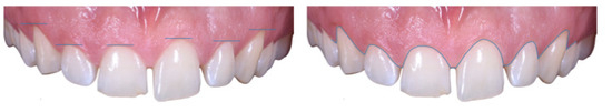 A patient of 27 years old required an improvement of his smile in a very short time, eliminating the presence of the diastemas. The dento-facial analysis reveals a gummy smile and a 4 mm dental exposure of the upper central incisors. The patient shows diastemas in the upper frontal group and a disto-rotation of the right central incisor. Besides an accentuated overbite, the occlusion is regular with an incisive protrusive guide and lateral canine guide. No symptoms referred to the ATM (temporomandibular articulation). Gingival analysis shows asymmetric gingival parables of 1.1 and 1.2 elements compared to 2.1 and 2.2, caused by an altered passive eruption. The aesthetics parameters established that the upper central incisors’ parables have to be 0.5–1 mm more apical than those of the lateral incisors [6].