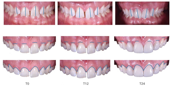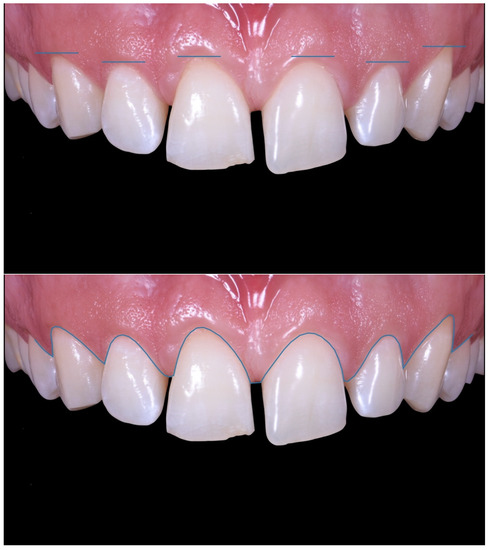 - Levi, Y.L.A.S.; Cota, L.V.S.; Maia, L.P. Digital smile design for gummy smile correction. Indian J. Dent. Res. 2019, 30, 803–806. [Google Scholar] [PubMed]