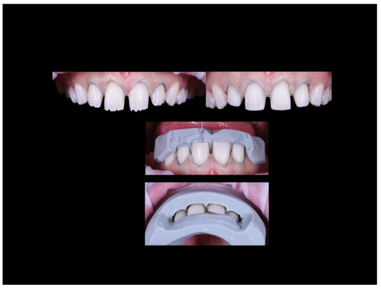 The fourth step: 12 months after the surgery, the four veneers are prepared with the mock-up drilling technique. The prosthetist calibrates the required space for future manufactures by printing on the teeth, not yet prepared, the diagnostic wax-up using a silicone mask and a self-curing resin. With this technique it is possible to remove the least dental tissue according to the type of material and also to the final volume that we want to obtain. During the same session, the preparations are scanned after an appropriate retraction of the gingival margins to expose the finishing line and to apply the provisional teeth. The dental laboratory receives the scanned files almost simultaneously. The matching allows then the overlapping of the virtual diagnostic wax-up to the scans of the preparations and the provisional veneers. The modeling of the veneers can be made by CAD, controlling the shape of the provisional model and the space between each tooth. The assembly in a virtual articulator avoids the harmful precontacts. The calibrated removal of the superficial layers of the manufact allows to make space for the vestibular stratification with veneering ceramic. A scanning prototype is realized through the die casting technique, which is duplicated in lithium disilicate. In the fifth and final session, the veneers are tested by trial cements to evaluate their fitting and color and then cemented. The cementation technique is made by conditioning both the ceramic material and the dental surface to have a high adhesion value. In this specific case, the internal surface of the veneers is treated with 9% hydrofluoric acid for 20 s, then rinsed and immerged in an ultrasound bath with pure alcohol for 3 min. After drying, the silane is applied and then evaporated with a heat source and bonding. The dental surface is cleaned by rubbers and airflow with erythritol powders, etched with 35% orthophosphoric acid for 15 s and the bonding applied. The cementation, under the dam and retraction threads to contain the cement spill is made by light-curing nanohybrid cement (Figure 1, Figure 2, Figure 3, Figure 4, Figure 5, Figure 6, Figure 7, Figure 8, Figure 9, Figure 10, Figure 11, Figure 12, Figure 13, Figure 14, Figure 15, Figure 16, Figure 17, Figure 18, Figure 19, Figure 20, Figure 21, Figure 22, Figure 23, Figure 24, Figure 25 and Figure 26).