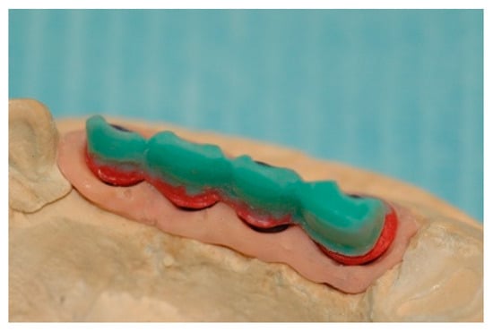 On the basis of the impression taken, the model was developed and a wax structure was created according to the prosthetic planning and the position of the implants on a model developed with removable soft gingiva (Figure 7).