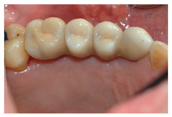 Intraoral X-ray examination: the lack of integrity and inconsistency of 2.3 and 2.5 (pillar elements of the fixed prosthesis) are highlighted (Figure 4).