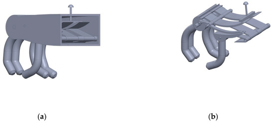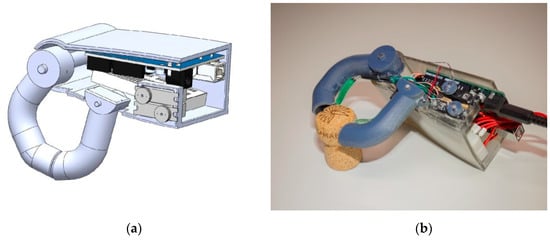 Conversion of the Götz hand to a sensorimotor, controller-controlled intelligent finger system. (a) 3D CAD reconstruction; (b) view after removal of the lateral chassis cover with insight into the electronics and servo motors. For further details on the hardware and software, please refer to [14].