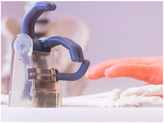 During the use of the initial 3D reconstruction of the hand, it was observed that the thumb lever broke under greater stress. The increased forces mainly in the thumb lever could be confirmed by finite element method (FEM) analysis (see Figure 1 in [9] or under the link: https://doi.org/10.3390/prosthesis2030020). Therefore, the mechanism of the thumb lever was revised: The newly developed mechanism of the thumb joint, which causes the finger and thumb roller to rotate in opposite directions, was realized with two power levers. This improved the tension and the distribution of forces in the parts (maximum stress of about in the old mechanism versus (von Mises) in the new mechanism) [10]. The 3D-printed polymer replica can be seen in Figure 3.