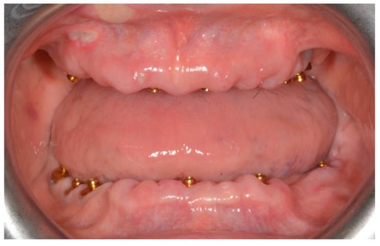 In elderly people, one of the most important problems in dental healthcare is edentulism. Complete removable dentures were the conventional solution for treating edentulism; nevertheless, the expectations of the elderly population have changed in the last years with the desire for more stable prosthesis using dental implants. A reliable compromise in the lower arch is a tissue-supported and implant-retained overdenture delivered on two implants [1]. Among the benefits of this prosthetic solution, a conventional implant-supported overdenture is an economically viable solution, and easy for the patients to keep clean and maintain. In the literature, several studies supported the ease of keeping overdenture clean [1]. On the other hand, in patients with good hygienic maintenance, suitable hard and soft tissues conditions, and dealing with more complex surgical and prosthetic procedures, insertion of a higher number of implants enables the delivery of a fixed or hybrid implant-supported prosthesis [2]. Although the debate on the most appropriate implant number and position is still ongoing, six implants may be preferable to four in the longer follow-up, reducing the amount of peri-implant bone loss [3] when a fixed solution is proposed. In fact, hygienic maintenance of the prosthesis can be challenging, particularly in patients classified as Cawood and Howell class V or VI, when extensive prosthetic flanges are needed. In these patients, a hybrid overdenture (implant-supported) can be a reliable option. As the name implies, hybrid overdenture consists of a metal bar permanently fixed on implants to support an overdenture (metal counterpart and acrylic teeth). This solution allows a fixed solution that can be removed by the patient.