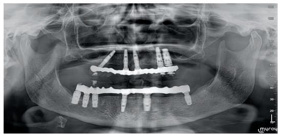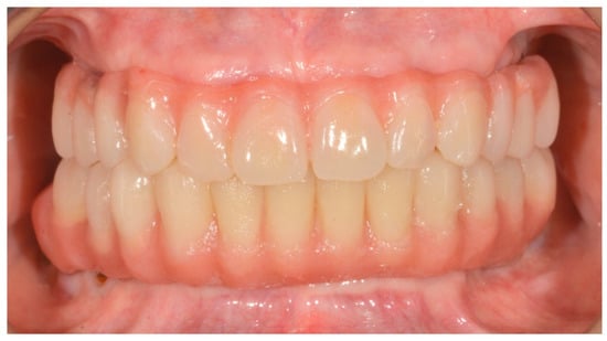 - Scrascia, R.; Fiorillo, L.; Gaita, V.; Secondo, L.; Nicita, F.; Cervino, G. Implant-Supported Prosthesis for Edentulous Patient Rehabilitation. From Temporary Prosthesis to Definitive with a New Protocol: A Single Case Report. Prosthesis 2020, 2, 10–24. [Google Scholar] [CrossRef]