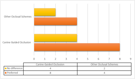 - Rehmann, P.; Balkenhol, M.; Ferger, P.; Wöstmann, B. Influence of the occlusal concept of complete dentures on patient satisfaction in the initial phase after fitting: Bilateral balanced occlusion vs canine guidance. Int. J. Prosthodont. 2008, 21, 1. [Google Scholar]