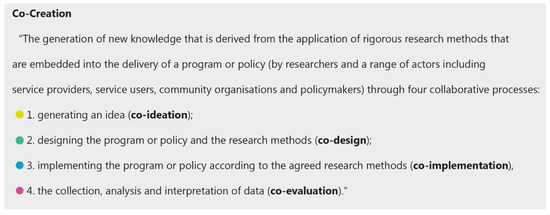 - Pearce, T.; Maple, M.; Shakeshaft, A.; Wayland, S.; McKay, K. What is the Co-Creation of New Knowledge? A Content Analysis and Proposed Definition for Health Interventions. Int. J. Environ. Res. Public Health 2020, 17, 2229. [Google Scholar] [CrossRef]