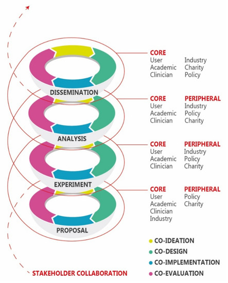 In recent years, translational healthcare research, which aims to translate research into practice to reach patients [25], has experienced benefits of expanding the range of collaborative stakeholders [26,27]. Within pharmaceutical development, open innovation has enabled collaboration between researchers, industry agencies, users, and policy makers [26]. Open innovation provides a framework that enables research teams to conduct external collaborations by sharing information, resources, and intellectual property [28]. Within healthcare, collaboration with patients and oncology nurses has resulted in studies that identify improvements for cancer diagnosis services, such as mobile applications [29]. Within assistive technology, studies have presented how using techniques to engage a range of stakeholders can assist in creating solutions that integrate into people’s lives, for example, rehabilitation advancement for people with multiple sclerosis [30], and technological innovation for people living with dementia [31]. Living laboratories that monitor everyday activities of people within real-life scenarios have enabled researchers to evaluate the usability of healthcare technologies and assess health outcomes [32]. Participatory research methods implemented within living laboratories have provided an opportunity for users to share feedback and suggestions for solution improvements [32]. A consistent factor within these examples is the involvement of patients or users, as collaborators within the research process, and how their involvement informs research outcomes. Co-creation Figure 1 can be an approach to facilitate such a form of collaboration, in particular between researchers, users, and clinicians.