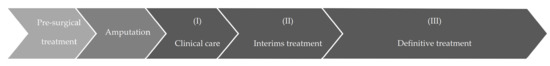 The treatment process contains three major phases (Figure 1) after amputation: (I) clinical care involving wound healing processes; (II) the treatment of the patient with an interim prosthesis; (III) and finally the treatment of the patient with a definitive prosthesis. A short description of each phase with regard to the German context follows [12,15].