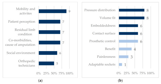 A weighting of individual aspects emerged from the interviews (Figure 2a). The factors influencing socket manufacturing demonstrate the strong patient-centered focus of the orthopedic technician. Nine orthopedic technicians outline mobility score and activities as an important aspect. This point considers the patient’s mobility before and after the amputation, as well as the desired mobility of the patient. More than half of the respondents name each of the following aspects as necessary information for choosing socket technique: patient perception (7 experts state this aspect), residual limb condition (7), co-morbidities and cause of amputation (7), and social environment (6). The orthopedic technicians interviewed emphasized that the patient perception concerns the individual’s sensation of pain, comfort, and body image as well as experiences from previous socket treatment. The residual limb condition estimates the proportion of soft tissue, fat tissue, and muscle of the residual limb as well as the osseous situation. It strongly correlates with the co-morbidities and cause of amputation, as well as mobility and activities. Less mobility and voluminous residual limbs place lower demands on the contour accuracy of the prosthesis socket in comparison to skeletonized or muscularly residual limbs. Co-morbidities and the cause of amputation can influence wound healing and pain perception. Therefore, they are important aspects for choosing the proper socket technique. The social environment addresses the care needs of the patient as well as their housing situation and takes place in the anamnesis questionnaire. According to this, different prosthetic modules are applicable. Another aspect is the orthopedic technician (5). This aspect considers the specific certifications of an orthopedic technician and the limits on the socket techniques that the orthopedic technician is allowed to utilize.