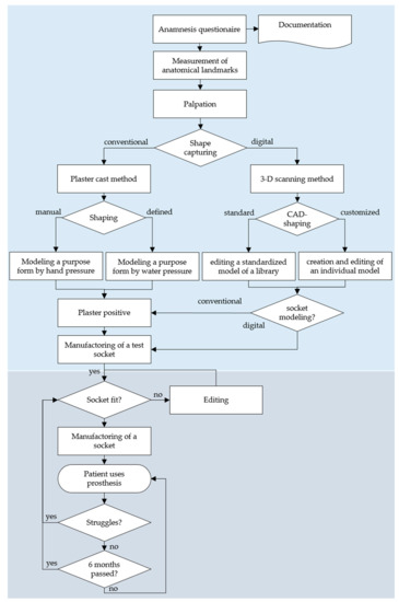 Socket manufacturing requires a model of the residual limb. Two methods for capturing this shape were mentioned by the orthopedic technicians: the plaster cast method and the 3-D scanning method. The plaster cast method is quoted by ten orthopedic technicians. It is considered to be the conventional method and is more exact than the 3-D scanning method. A special purpose form is shaped either by hand pressure, as practiced by nine orthopedic technicians, or by defined water pressure, as practiced by two orthopedic technicians. Thereby, two orthopedic technicians perform both methods. The hand pressure-method enables the creating of the special purpose form by the manual placement of soft tissues and is dependent on technician’s individual experiences and knowledge. The modeling by water pressure permits a special purpose form under full load and is more objective. A plaster positive can be produced based on the plaster negative. This model allows the manufacturing of a test socket by conventional thermoforming. Eight orthopedic technicians quoted the 3-D scanning method. This digital modeling method allows a volume-correlated geometry acquisition. Three orthopedic technicians reported that due to a lack of space and a reduced patient range of motion, the access of this digital modeling method to a patient’s anatomy has been limited. In addition to this, the scan does not allow the modeling of a special purpose form on the patient themselves. Alternatively, A special purpose form can be modeled by CAD-shaping. Six orthopedic technicians create customized models based on scan data and edit the individual model. Two orthopedic technicians additionally use standardized models of a library for customization and editing. Based on the digitally generated models, a material model of the residual limb can be produced, and a test socket can be manufactured conventionally. As an alternative, a digital socket can be modeled and manufactured by additive manufacturing or milled with a computerized numerical control. Two orthopedic technicians reported limits on the suitability of this 3-D scanning method for sockets with a high requirement for contour accuracy, as is the case with a residual limb with a low soft tissue percentage.
