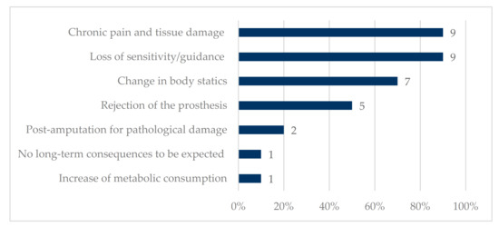 Orthopedic technicians assess the consequences of an unsuitable fit differently (Figure 4). Seven consequences can be derived from the expert survey according to an unsuitable socket fit. The most common consequences named are chronic pain and pathological tissue damage (9), as well as a loss of sensitivity/guidance and thus mobility (9). Pain and tissue damage (such as pressure ulcers) due to the socket being too large can be caused by friction between the socket and the residual limb, the impingement of the distal femoral end into the soft tissue, or inappropriate pressure loading. The effects of a socket that is too small in size are circulatory disturbance due to an unwanted vacuum at the distal end of the residual limb or unsuitable pressure loading. The majority of the orthopedic technicians also mentioned a change in body statics (7), in which the gait and the stability of the patient are affected negatively. It also leads to the loss of sensitivity/guidance and thus mobility. Furthermore, five orthopedic technicians stated that the previously named consequences can lead to the patient’s rejection of the prosthesis. Pain and an unsuitable gait may result in a loss of confidence and build negative associations. Less mentioned consequences include post-amputation for pathological damage (2) and an increase of metabolic consumption (1) following pathological tissue damage and change in body statics. One orthopedic technician stated that there are no long-term consequences to be expected (1) because of an unsuitable socket fit.