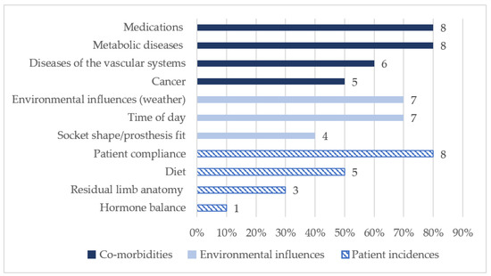 Influences from various co-morbidities are described frequently. More than half of the orthopedic technicians named medication (8; such as cortisone, water tablets), metabolic diseases (8; such as according to diabetes, rheumatism, and dialysis), and diseases of the vascular system (6; such as peripheral artery disease (PAD)), as leading to the swelling and shrinking of the residual limb within one day or leading to the changes in weight of the patient. Furthermore, five orthopedic technicians mention cancer in connection with chemotherapy and radiotherapy. Such therapies can favor water storage and weight changes. Thus, they can influence volume fluctuations.