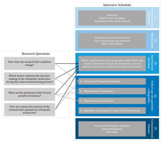 The aim of the research was to clarify the processes of prosthetic socket treatment after transfemoral amputation. Therefore, special focus was placed on the orthopedic technician’s point of view regarding their requirements as well as limitations of the process. The study contains four main research questions (see Figure 7):