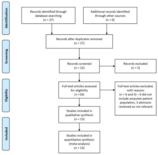 Using MEDLINE (PubMed), 88 results were originally found when using the primary search terms. Those results were refined and narrowed by adjusting the search terms used, rendering 23 results. Given the necessity to cover any other missing articles, the terms were then adjusted again to result in 27 records (Figure 1). Exclusion by publication language and date removed five titles. Screening abstracts resulted in a further six full-text articles being excluded for irrelevance to the subject (e.g., not including persons with limb loss as part of the patient population). Three articles were deemed as not relevant following closer examination of the abstract. The remaining 13 articles were included in qualitative synthesis and quantitative synthesis.