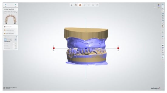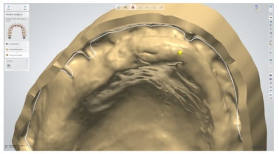 In the following step, three scans were performed in a laboratory scanner (E3, 3Shape™ A/S, Copenhagen, Denmark), which were the tissue surface of the baseplate-wash impression, the lower jaw cast and the baseplate wax rim in relation with the mandible cast (Figure 4). The “impression scanning” option was selected in the CAD software, in order to digitally shift the maxillary tissue surface from the negative representation (impression) to a positive representation (digital cast). Finally, the digital files were imported into the CAD software for further processing (Figure 5 and Figure 6). Next, the alignment of the casts took place by selecting reference points. The occlusal plane was determined by the digitized wax rim in the Dental System 2019 program (3Shape™ A/S, Copenhagen, Denmark) (Figure 7). The functional borders of the denture were next designed (Figure 8). The marking of the appropriate reference points on the alveolar ridge (canines, incisive papilla and maxillary tuberosity) followed for tooth set-up (Figure 9). The ideal path of insertion and the degree of undercut blocking was also determined in the software (Figure 10). In the following step, parameters for the appropriate tooth selection and set-up were determined. In the present case, the option for milling teeth was preferred. Therefore, after the initial selection of size and shape, teeth were further individualized for the needs of the occlusion in this case (Figure 11 and Figure 12). Upon the completion of the tooth set-up, the design of the denture base and the “configuration of cameo surface” followed. A key parameter was the thickness of the palate for the upper denture. In this case, a thickness of 1.5 mm was chosen. Finally, a monolithic trial denture was manufactured utilizing a 3D printer (Asiga Max UV™, Sydney, Australia) designated for rapid prototypes.