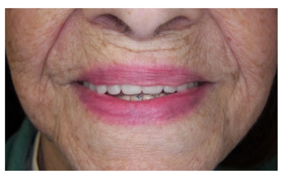 A corrective impression with tissue conditioner material (GC® tissue conditioner, GC® Corporation, Tokyo, Japan) was taken in the same appointment. The absorbed residual ridge and the flabby mucosa in the anterior region advocated for this decision. The monolithic denture in combination with the selected material facilitated the taking of an accurate functional impression (Figure 13). The final outcome was approved by the clinician and the patient and was photographically documented (Figure 14, Figure 15 and Figure 16). Finally, the adapted trial denture and the photos were shipped to the laboratory for final adjustments and completion of the manufacturing.