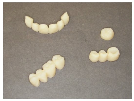 - Srinivasan, M.; Gjengedal, H.; Cattani-Lorente, M.; Moussa, M.; Durual, S.; Schimmel, M.; Müller, F. CAD/CAM milled complete removable dental prostheses: An in vitro evaluation of biocompatibility, mechanical properties, and surface roughness. Dent. Mater. J. 2018, 37, 526–533. [Google Scholar] [CrossRef] [PubMed] [Green Version]