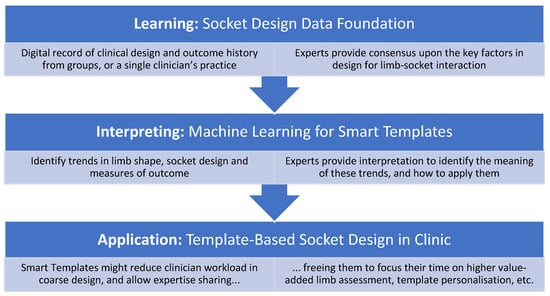 Proposed process overview for developing and using smart templates as part of expert-informed, evidence-based socket design. Instead of automating design at the expense of clinicians, the proposal includes the experts in each stage of development and clinical use.