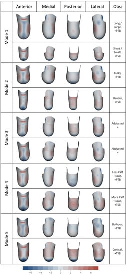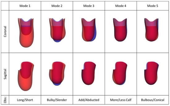 The SLM was able to discriminate between the main independent modes of limb shape variation (Figure 5). Variation presented as the limb’s overall size (mode 1 containing 85% of population variation), with larger limb circumference and width corresponding with longer length; and the limb’s soft tissue bulk (mode 2, 8.3% of variation). Mode 3 (2.5% of variation) described abduction–adduction angle at the knee. Mode 4 (1.1% of variation) represented calf muscle bulk, most apparent in the sagittal view, and mode 5 (0.6% of variation) contained the limb’s bulbous-conical profiles in the sagittal and coronal planes. Mode 2 demonstrates that larger circumference limbs were more likely to be bulbous shaped and smaller circumference limbs a more cylindrical or conical, and Modes 4 and 5 indicate how the profile can also vary independent of limb size or soft tissue bulk.