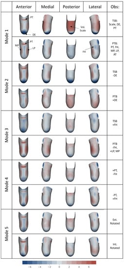 The SDM was able to discriminate between the main independent trends in prosthetic socket design variation (Figure 6). The first mode (containing 35% of population variation) showed an apparent trend between the commonly grouped rectifications of the PTB and TSB socket design philosophies. At one extreme of Mode 1, PTB-dominant design features were observed with notable rectifications at the patella tendon bar, lateral and medial areas either side of the anterior tibial crest (all visible on the anterior view), and relief over the fibula head (visible on the lateral view). Posteriorly, nearly matching limb–socket fit was observed. At the other extreme of Mode 1, TSB-dominant design features were observed. The socket was a similar shape to the limb, with slight press-fit/interference around the limb periphery and few local rectifications except at the patella tendon bar, and substantial distal tip off-loading. The next three modes appeared to show these local socket rectifications in combination with various extents of the PTB-TSB grouped features. Mode 2 (25% of variation) presented variation between PTB and TSB designs but with the distal tip off-loading aligned with the PTB design. Mode 3 (8.5% of variation) showed the fibula head off-loading feature presenting more strongly in the TSB design, than in the PTB with which it is normally associated. Mode 4 (5.1% of variation) showed variation in the patella tendon bar rectifications. Finally, mode 5 (3.9% of variation) showed little variation in the pattern or magnitudes of rectification, but showed their locations varying in internal–external rotation. In summary, PCA performed upon socket rectification data did not generate an SDM which discriminated between individual rectifications, instead identifying variance in combined rectification groups.