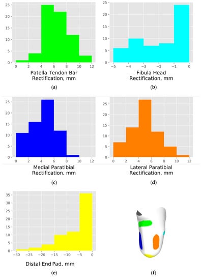 Histograms of local rectification sizes across the training population for (a) patella tendon, (b) fibula head, (c) medial and (d) lateral paratibial, and (e) distal end design features as mapped on the (f) 3D socket shape. −ve denotes buildup; +ve denotes carve.