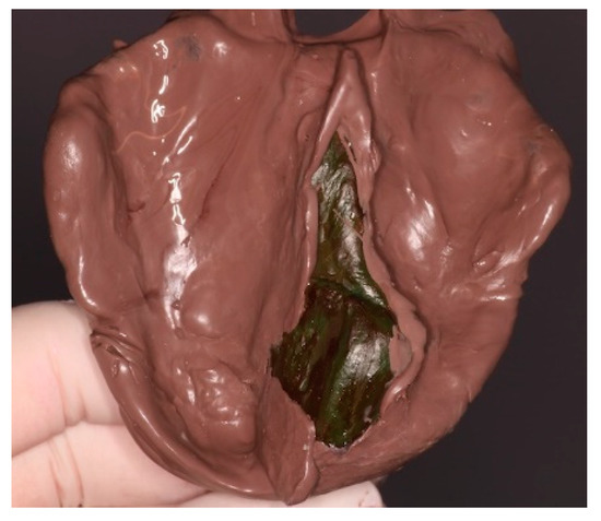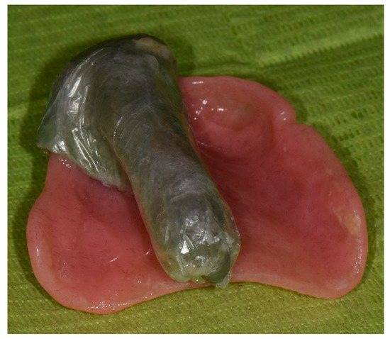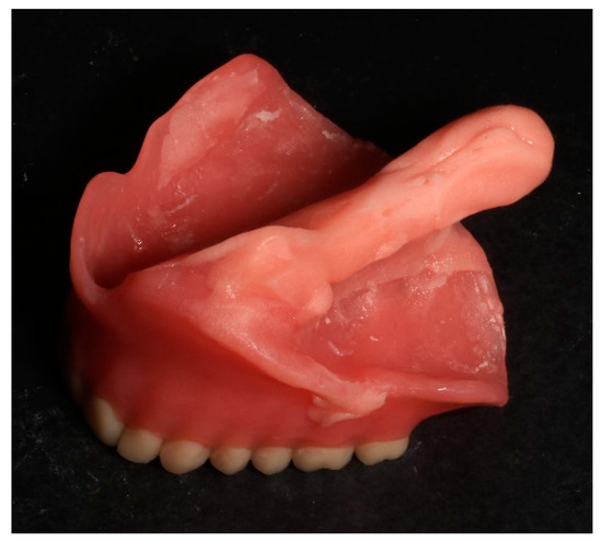 A 56-year old Caucasian male was referred to the Graduate Prosthodontics Clinic at the National and Kapodistrian University of Athens for prosthodontic rehabilitation. The patient presented with problems in speech and swallowing caused by a large palatal defect associated with cleft palate. His medical history was unremarkable and negative for medications or known allergies. The history of his present illness revealed no attempts for surgical reconstruction. The patient had lived in a rural, distant area throughout his whole life, with challenging access to dental care. He reported that he first visited a dental clinic at the age of 15, when a general dentist fabricated an acrylic plate attempting to cover the hard palate and restore his palatal defect. At the age of 30, the same general dentist extracted all his remaining decayed teeth and fabricated a conventional complete denture. Both the acrylic plate and the complete denture were unable to successfully obturate his palatal defect and restore his speech and swallowing, therefore, the patient modified his complete denture, and all his consequent conventional complete dentures, by adding a significant amount of modeling clay in their intaglio surface. In these unusual self-made prosthesis, the clay was modeled intraorally and followed the shape of the defect to improve swallowing and food regurgitation to some extent (Figure 1). However, since the self-fabricated prosthesis did not have adequate posterior extension to the pharyngeal walls, air emission remained, and speech hypernasality was not sufficiently addressed.