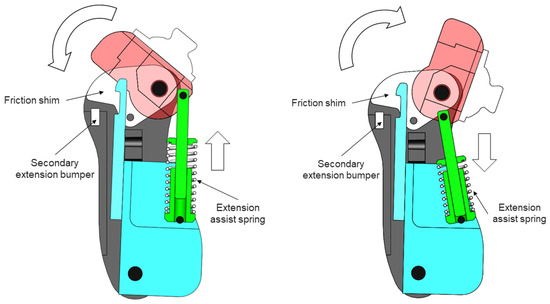 The main functional components of the variable cadence controller (VCC). Left: Increased friction and low spring force (and secondary extension bumper) decreases terminal impact near full extension; Right: Progressively increased friction (light pink area) and spring force with increase knee flexion helps to limit heel-rise and duration of swing-phase. The technical research details related to the development of the swing-phase controller can be found in [13,19].