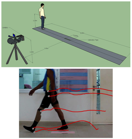 Gait data were collected using a camera-based approach based on established best practices [21,22]. Eight white round stickers with a diameter of 20 mm were adhered on the participants’ right and left lower limbs over the greater trochanter, iliac crest, lateral malleolus (or in line with the intact lateral malleolus), and lateral knee axis (or over the mechanical joint center of the prosthetic knee). Sagittal plane data were collected via a digital camcorder (Canon EOS REBEL T5 W/18-55, Canon Inc., Tokyo, Japan). The camera had a minimum resolution and frame rate of 1280 × 720 and 25 fps, respectively. The camera was placed on a tripod at a height of 1.20 m (approximately hip height) above the ground at a distance of 3 m from the 8-m long walkway [21]. A 50 cm line was marked at the center and parallel to the walkway to allow for calibration of distances during video analysis (Figure 3). The participants were instructed to walk along the walkway at self-selected (normal) and fast-walking speeds. They walked in both directions to collect data bilaterally with two videos in each direction at each speed.