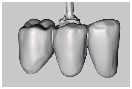 The master model was obtained by integrating two intraoral digital impressions (Figure 4), plus a scan of the temporary crowns using a Carestream CS3600 (Carestream Dental, Atlanta, GA, USA). The first impression scans the abutments, without retractor cords, following the recommended scanning protocol (both arches plus intercuspidal position). Next, an impression with the provisional restoration in place was taken. Subsequently, temporary crowns were scanned extraorally, acquiring their inner and outer margins (Figure 5). The resulting STL files were processed to produce a digital master model in which the data of the finish line of the abutments and of the surrounding tissues were derived from the temporary crowns. The workflow was performed using MeshMixer (Autodesk, Mill Valley, CA, USA) and Exocad (Align Technology, San Jose, CA, USA) (Figure 6).
