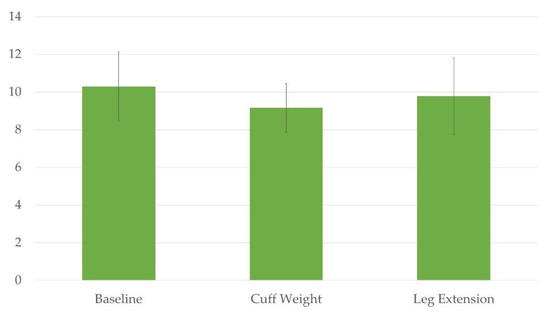 Technical difficulties and the peculiarities of some participants’ throwing stances prevented the use of video data for kinematic analyses for more than seven of the participants (five male and two female). Comparing the release-point distances of the intervention conditions against the control conditions (Table 2) revealed a significant advantage for the lengthened trailing leg condition (p = 0.026), with release points being an average of 9.2 cm closer to the target (95% confidence interval (CI) [−0.1 cm, 18.5 cm]), and this was a medium-to-strong effect (Cohen’s d = 0.67). By comparison, the weighted trailing leg yielded no significant advantage (Table 3), with an average reduction in throwing distance of merely 1.2 cm (95% CI [−11.4 cm, 13.8 cm]), for an effect size of 0.07. No significant differences were found for elbow angle, lead leg angle or release angle.