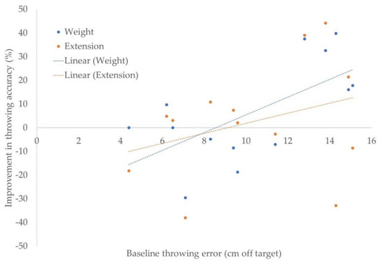 Accuracy differences, expressed as the average distance of hits from the bullseye (Table 1), showed a trend in favor of the weighted and the lengthened condition, which resulted in about 11% and 5% lower deviations from the target, respectively, than the baseline condition (Figure 1). However, these differences were not statistically significant. Standardized effect sizes (Cohen’s d) were 0.36 for the weighted condition and 0.13 for the lengthened condition, compared to the baseline condition. Post hoc analysis (Figure 2) showed a weak-to-moderate inverse correlation between skill level (based on baseline throwing accuracy) and the benefits of the modifications (measured by the relative improvement in accuracy).