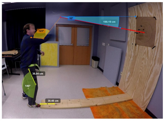 The distance of the release point from the target was measured using two-dimensional video analysis based on recordings of the participants’ throws in the sagittal plane (GoPro Hero 4 Silver camera, filming at 1080 p, 60 fps). For post-processing, the video data were uploaded into Kinovea (version 0.8.15). After calibrating the software using a known segment of 30.48 cm (1 ft) that was recorded in every data file, the video was advanced frame by frame to find the release point of each throw. Once the exact release point was located, the markers on the participant’s landmarks were used to analyze the participant’s elbow angle, lead leg angle and release angle. The distance calibration allowed easy calculation of the distance from the release point to the bullseye (Figure 4). The accuracy of a given throw was not a factor in these analyses.