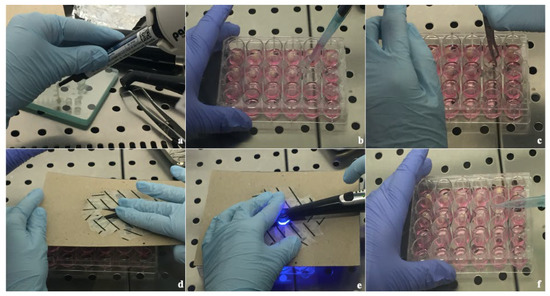 Application of experimental groups (a) Placing the material in the molds, (b) Removal of cells medium, (c) Placement of material on cells, (d) Placement of the barrier, (e) Polymerization of the material, and (f) Addition of cell mediums.