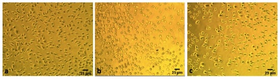 The morphological views of cells. Experimental Groups: (a) Fill-Up!™ polymerized with VALO™ Cordless LCU, (b) ACTIVA™ BioACTIVE-RESTORATIVE™ polymerized with VALO™ Cordless LCU, and (c) HyperFIL® HAp polymerized with VALO™ Cordless. The scale bar in each image equals to 25 μm.