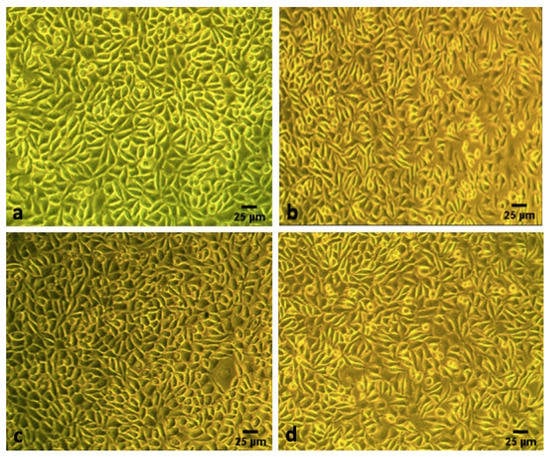 In the experimental groups, it was observed that the smooth and spindle structures of L929 fibroblast cells were disrupted, became rounded, and the intercellular space increased (Figure 2a–c).