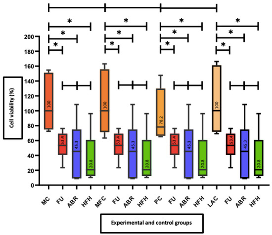 Comparison of cell viability (%) of experimental and control groups. Cell viability was expressed as a percentage of medium control group cell cultures. Results of Kruskal–Wallis test and Mann–Whitney U test. *: Indicates statistically significant differences in cell viability (p < 0.05). MC: Medium Control, FU: Fill Up!™, ABR: ACTIVA™ BioACTIVE-RESTORATIVE™, HFH: HyperFIL® HAp, MFC: Medium-Free Control, PC: Physical Control, LAC: Light Applied Control.