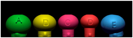 A total of 30 samples were considered for this in vitro research. No similar study was found in the literature. For this reason, a priori sample size analysis was not performed. Each sample consisted of a monolithic zirconia restoration (MZR) bonded on a TBA (Ti-link Abutment, Osstem Implant, Seoul, South Korea). All the MZRs were designed (computer-aided design, CAD) and manufactured (computer-aided manufacturing, CAM) in one dental laboratory in Italy using a standardized protocol as recommended by the manufacturer (ST ML, UpCera Shenzhen Dental Technology Co. LTD., Nobil-Metal, Asti, Italy). The percent composition of the used zirconia was ZrO2 + HfO2 + Y2O3 > 98%; Er2O3 < 1.0%; Fe2O3 < 0.3%; Pr2O3 < 0.2%; other oxides < 0.5%. Five different shapes were designed and fabricated, representing the possible extreme clinical variables (Table 1 and Figure 1). The main physical data are reported in Table 2.